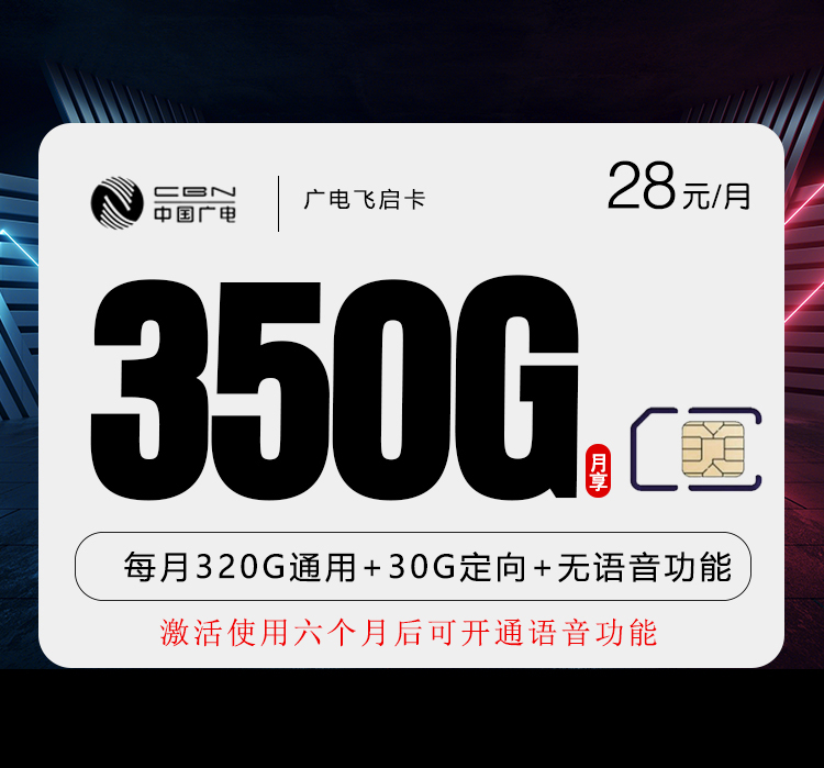 产品套餐:28元350G 激活使用3个月后可开通语音功能原套餐28元月租包含120G通用流量+30G定向流量,无语音功能(3个月后可开通),首月按天计费,套餐外流量3元/G,短彩信0.1元/条。优惠详情激活快递处专属链接充值100元1、激活后首充100话费直接到账,添加120G通用流量(可结转)+30G定向流量,再加赠200G全国通用流量,赠送流量和定向流量不结转。2、流量优先级顺序为:定向流量一
